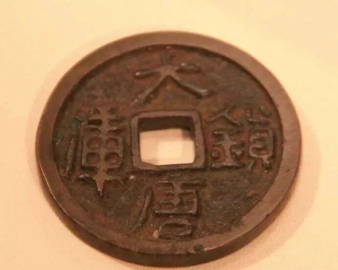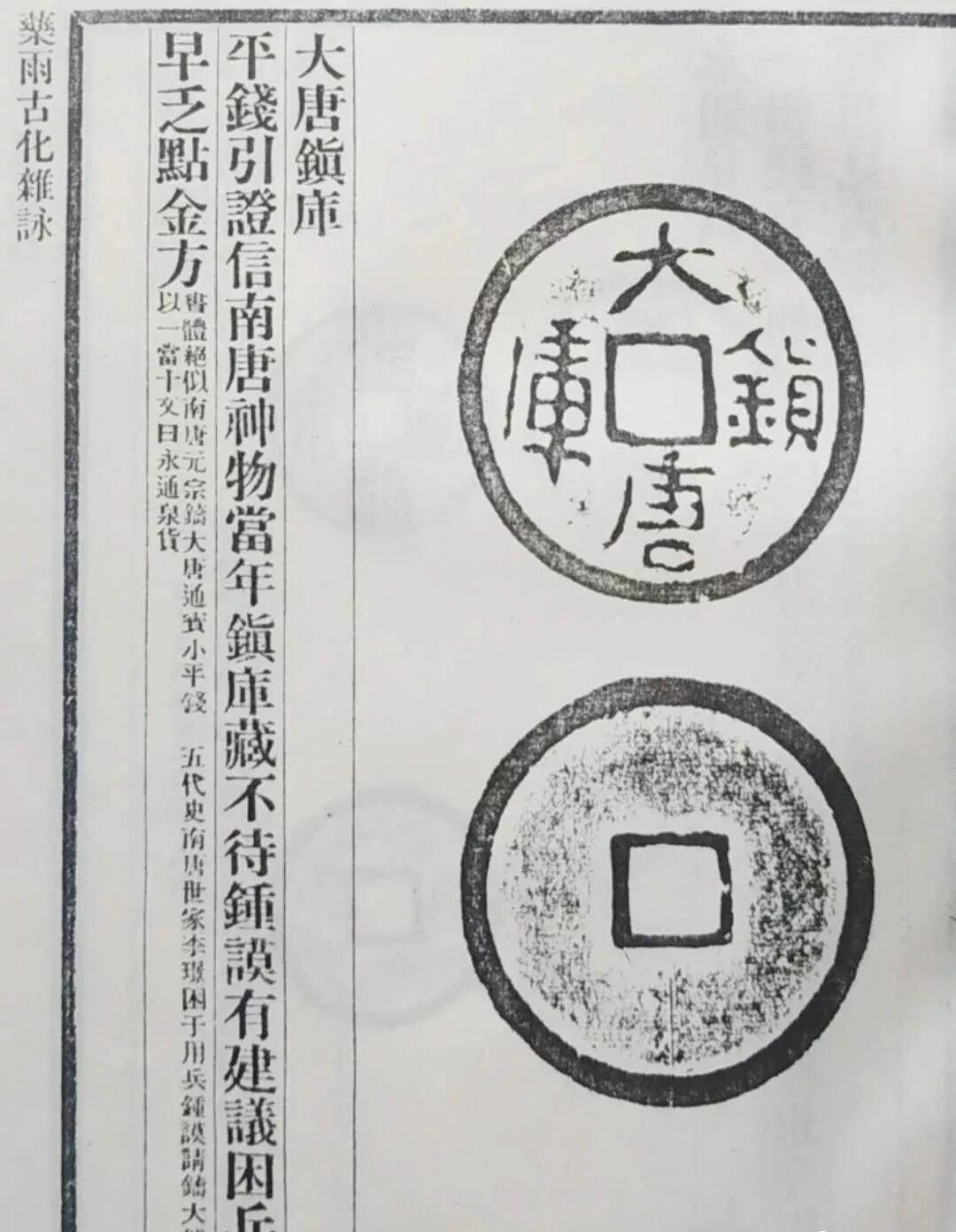 南唐时期大唐镇库钱,直径6厘米,重93.7克。据郑家相说此钱为方药雨于20世纪初得自天津,现藏国家博物馆。