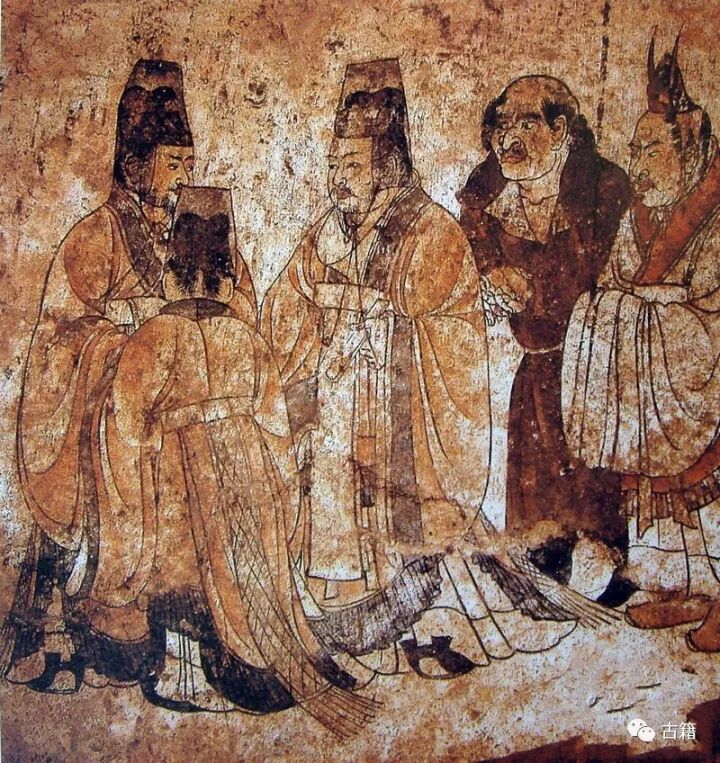 《礼宾图》共绘有6个人物,大致可分为前方的3人和后方的3人两部分。前方即北侧,在画面左侧的3个文官,都戴着纱罩的笼冠,穿着红色长袍。前数第3人手持笏,飘带曳地。第2人只能看到背部,与其他两人相向而立。他们3人好像引导身后的宾客去朝见章怀太子,所以,他们可能是唐王朝鸿胪寺即礼宾院的官吏。《新唐书·车服志》有“乌纱帽者,视事及宴见宾客之服也”的记载,说明当时在接待宾客时,有特定的服饰制度。唐代群臣五品以上持象牙笏,六品以下持竹笏,这幅壁画中的官吏所持显然是象牙笏。唐代担当迎送宾客职责的是鸿胪寺。根据《唐六典》卷18:“凡四方夷狄君长朝见者,辨其等位,以宾待之”的记载,此人可能是鸿胪寺五品以上的官员。