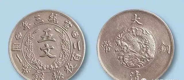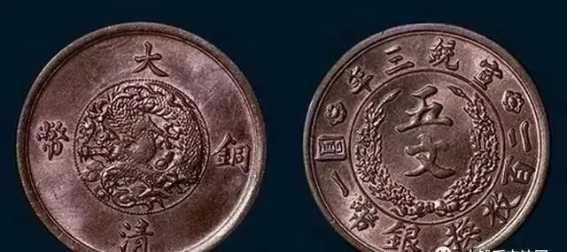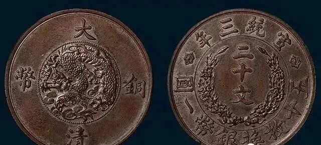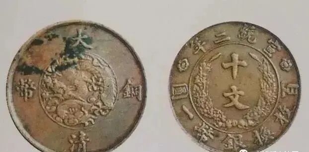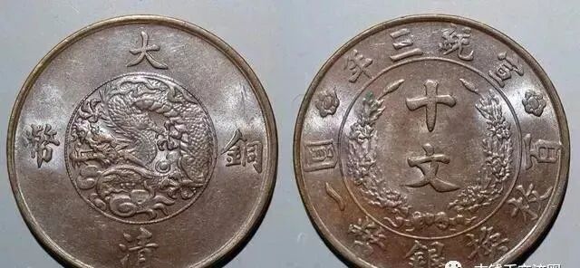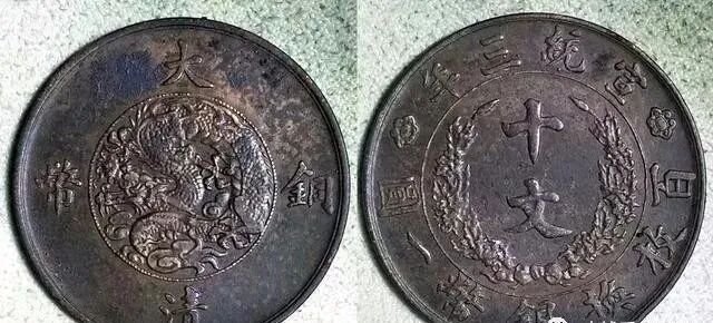 宣三大清铜币是1907年户部改制为度支部后在宣统三年设计的一套铜币,其做工精美,用铜精良,欲通行全国,统一币法和铸币权。但是还没来得及发行就被革命党赶下台了,大清亡了,也让这套币胎死腹中,只有十文得以大量发行。