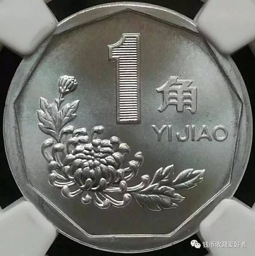 菊花1角硬币是最后一枚标有“中华人民共和国”字样的1角硬币,其后发行的兰花1角硬币改为“中国人民银行”字样。菊花1角使用了铝锌材质(类似银币,但比银币质地还软)。这种材质一方面成就了菊花1角很高的浮雕效果,另一方面也造成它很不耐磨,极易擦划和碰伤,容易氧化,不易保存,所以在市场流通中耗损率相当高,被银行回收数量庞大,存世量相对于其它币种要少许多,因此收藏硬币最好考虑全新品。