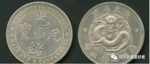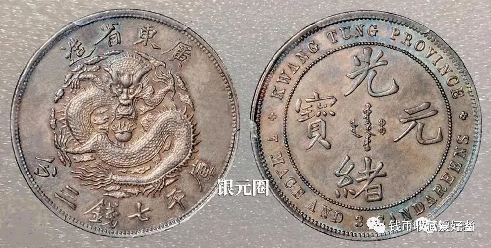 中国大规模正式开始机制银币于广东。光绪十五年(公元1889年),清政府批准在广东设局铸造“光绪元宝”银币。这种银币因为铸有蟠龙,俗称“龙洋”。周围饰以汉、满两种文字,印有“光绪元宝广东省造”、“库平七钱三分”字样。 因当时民间将国外流入的银元称为“番饼”,此版正面铸英文,类似外国币,百姓沿袭旧名,故称之为番版,日久讹传为“反版”。因以库平七钱三分为率,并将英文铸于正面,以便与外国银币进行交易,故亦称“七三反版”。![]()