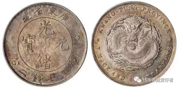 正面中央珠圈内分别用汉满文字铸光绪元宝四字,外围上铸英文译广东省,下铸英文译七钱二分,两旁分铸十字花星;背面中央铸蟠龙图,外围上铸汉字“广东省造”,下铸“库平七钱二分”,两旁分铸十字花星。直径38.8mm,重量27g,成色88%,珍稀度:一级。 当时清廷认为洋文置于币的正面,不合体例,下令将英文铸于背面蟠龙外,故此币并未投入使用,仅留存样币三枚,是中国最著名的银元大名誉品。