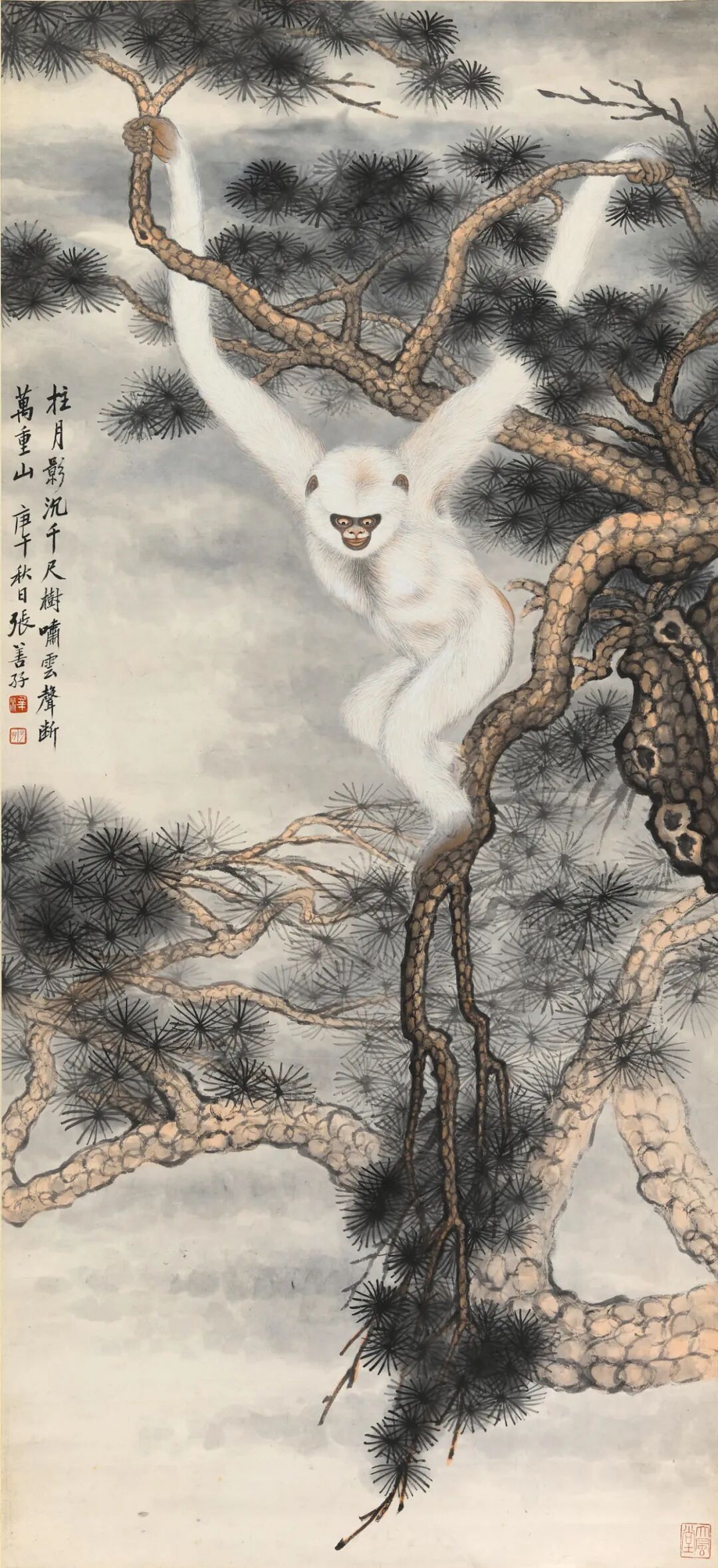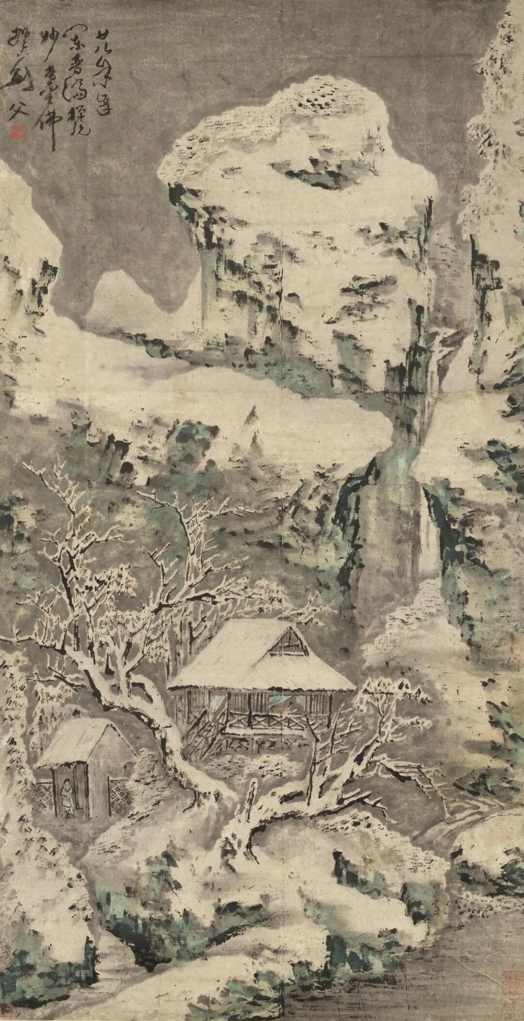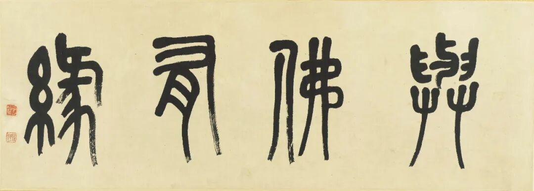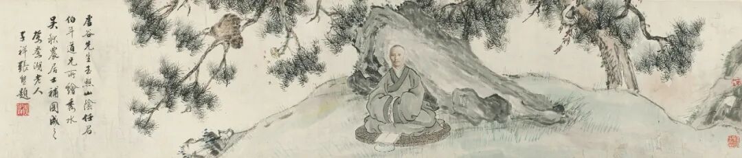 张大千对敦煌石窟壁画的深入研习影响了其一生的创作。《持花仕女图》是一幅带有典型敦煌特征的作品。画面设色古艳明丽,人物风度典雅、仪态端庄,又不失灵动。本幅受赠人林清霓1965年在旧金山中国城开设了一家专营中国艺术的画廊。1967年4月,张大千一行在加州旅行,期间拜访了好友林清霓,为支持林清霓的画廊事业,张大千特作此画并当场举行义卖,由旧金山画商曹仲英以九百美金慷慨购下,所筹资金用于画廊经营。虚谷留下的肖像画作品十分罕见,仅存的几件大部分入藏于美术馆。本幅《仙影》展示了虚谷人物画的典型特征。图中人物倚坐于梅花之下,五官刻画细腻清晰,富有立体感,类似晚明人物画家曾鲸(1564-1647)之风格。本幅肖像作品展现了任颐高超的肖像画技术。细察画面,可见任颐以点笔写照人物,层层分色点染过度,人物面部具有类似照相的写实效果。而与描写虚谷写实的脸部完全不同,任颐以写意的手法,数笔勾勒出人物所著僧袍。另有吴毂祥补景,张熊题识,记录此画创作过程。画卷引首则由张祖翼以篆书题写。齐白石93岁高龄之作。画中玉兰花苞亭亭玉立,枝干细支交横纵错,用笔顿挫有力,线条节奏灵活生动,花中飞入一对蜜蜂,增添了画面的生机律动感。更为巧妙的是,画家以看似含糊的湿笔再现出蜜蜂飞行时翅膀的快速震动感,其身上的藤黄恰好与盛开的玉兰花蕊遥相呼应。