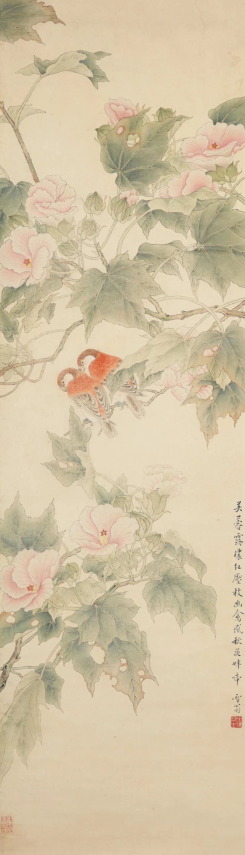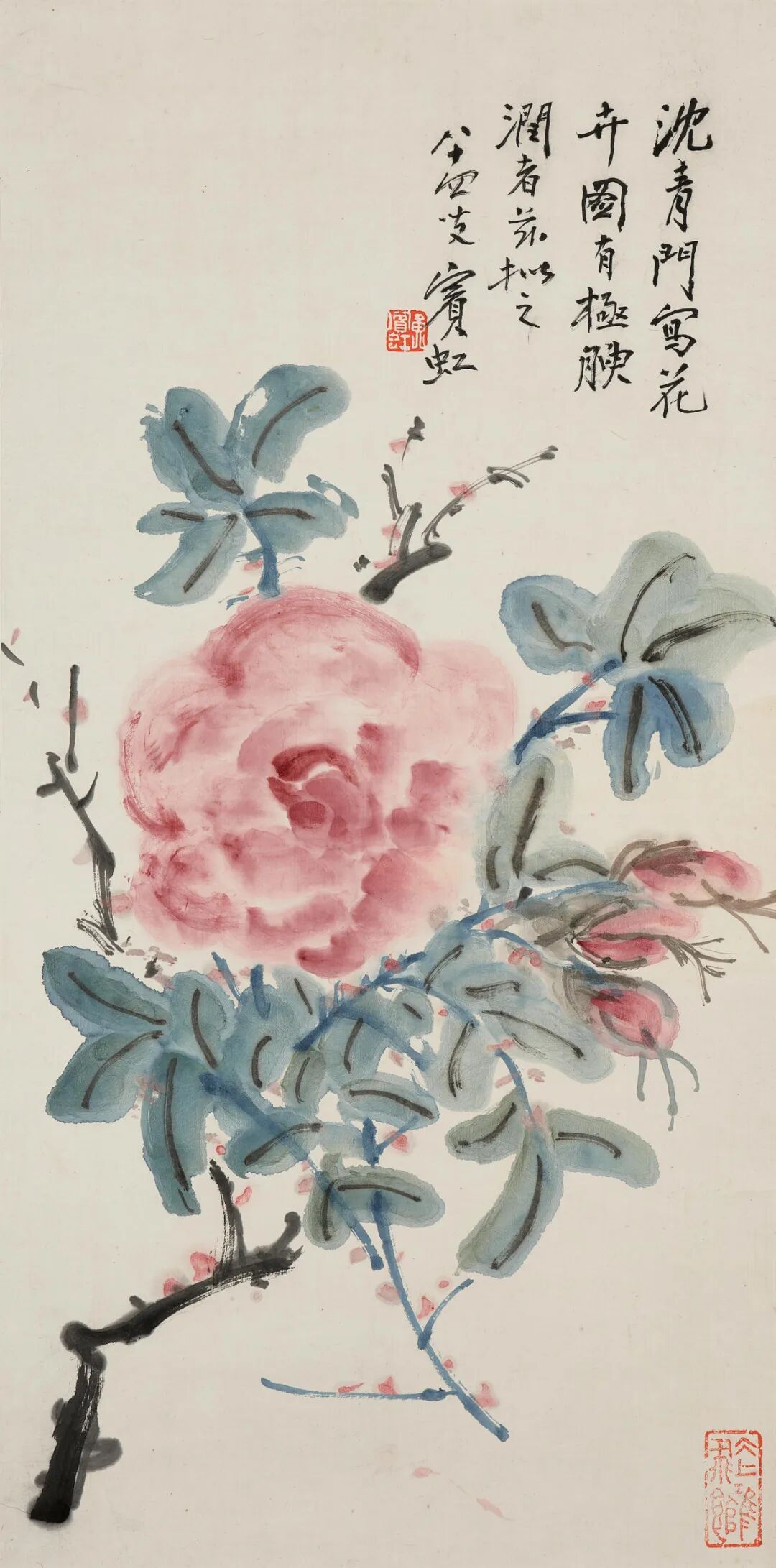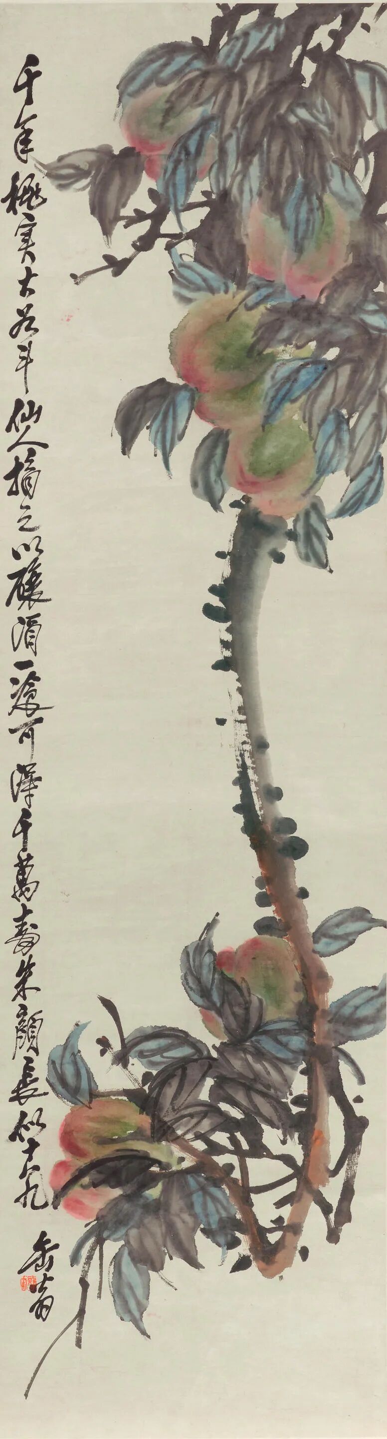 张大千对敦煌石窟壁画的深入研习影响了其一生的创作。《持花仕女图》是一幅带有典型敦煌特征的作品。画面设色古艳明丽,人物风度典雅、仪态端庄,又不失灵动。本幅受赠人林清霓1965年在旧金山中国城开设了一家专营中国艺术的画廊。1967年4月,张大千一行在加州旅行,期间拜访了好友林清霓,为支持林清霓的画廊事业,张大千特作此画并当场举行义卖,由旧金山画商曹仲英以九百美金慷慨购下,所筹资金用于画廊经营。虚谷留下的肖像画作品十分罕见,仅存的几件大部分入藏于美术馆。本幅《仙影》展示了虚谷人物画的典型特征。图中人物倚坐于梅花之下,五官刻画细腻清晰,富有立体感,类似晚明人物画家曾鲸(1564-1647)之风格。本幅肖像作品展现了任颐高超的肖像画技术。细察画面,可见任颐以点笔写照人物,层层分色点染过度,人物面部具有类似照相的写实效果。而与描写虚谷写实的脸部完全不同,任颐以写意的手法,数笔勾勒出人物所著僧袍。另有吴毂祥补景,张熊题识,记录此画创作过程。画卷引首则由张祖翼以篆书题写。齐白石93岁高龄之作。画中玉兰花苞亭亭玉立,枝干细支交横纵错,用笔顿挫有力,线条节奏灵活生动,花中飞入一对蜜蜂,增添了画面的生机律动感。更为巧妙的是,画家以看似含糊的湿笔再现出蜜蜂飞行时翅膀的快速震动感,其身上的藤黄恰好与盛开的玉兰花蕊遥相呼应。