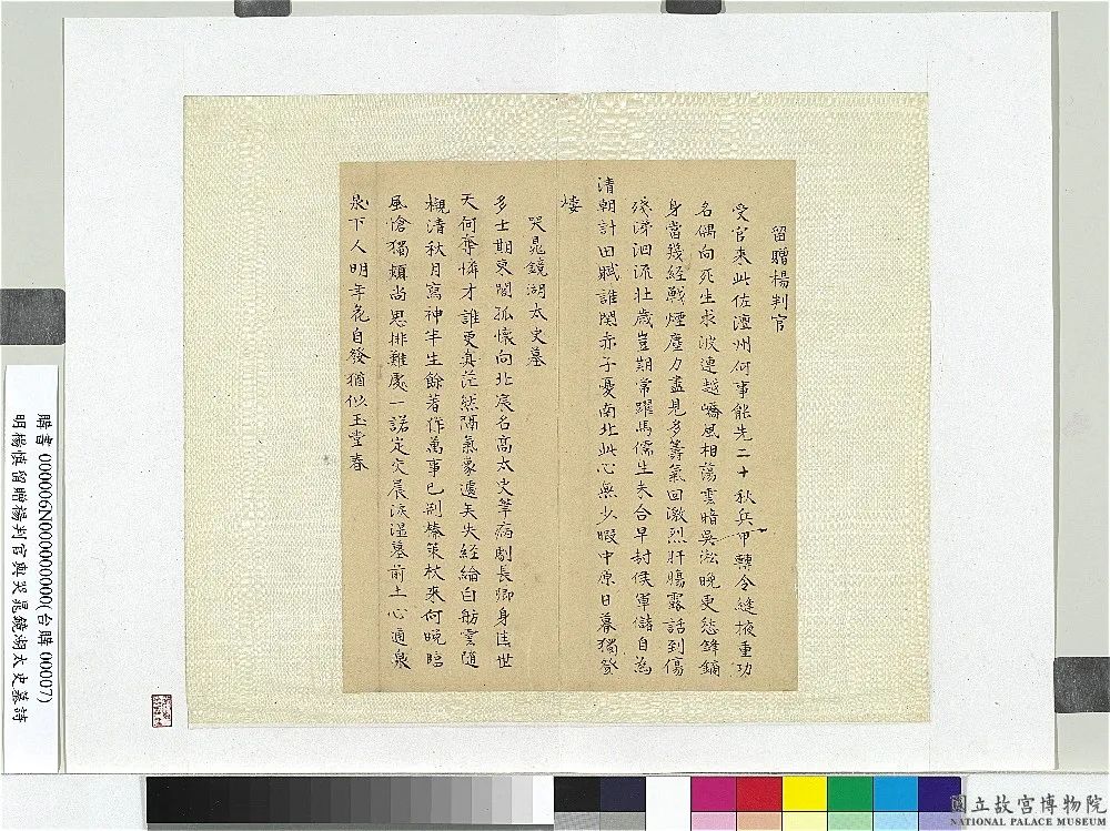 杨慎《留赠杨判官与哭晁镜湖太史墓诗诗页》纸本楷书 26.5×15.6cm 台北故宫博物院藏