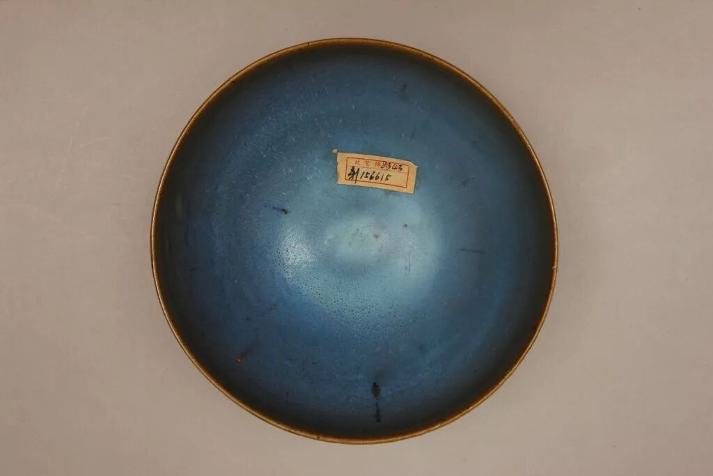 钧窑天蓝釉碗,金,高8.2厘米,口径19厘米,足径5.7厘米。碗敛口,深弧壁,圈足。通体及圈足内均施天蓝色釉,足底无釉。 钧窑地处今河南省禹州市,在宋、金对峙时期这里属于金代统治范围。此碗在碗形、釉色、底足处理等方面与典型的宋代钧窑有一定差异,或为金代钧窑制品。