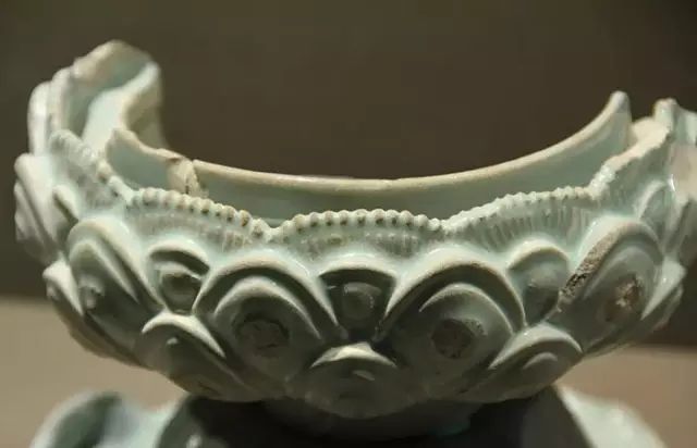 北宋 汝窑天青釉刻花莲瓣纹荷叶座熏炉(残) 局部