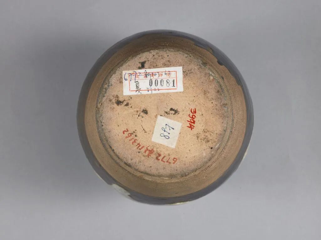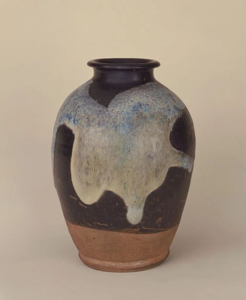 此罐釉色乌亮,衬托着天蓝色不规则大片叶状块斑,鲜明活泼,类似这样完整的器形,在同类作品中较为少见,系河南鲁山窑所产花瓷中的精品。