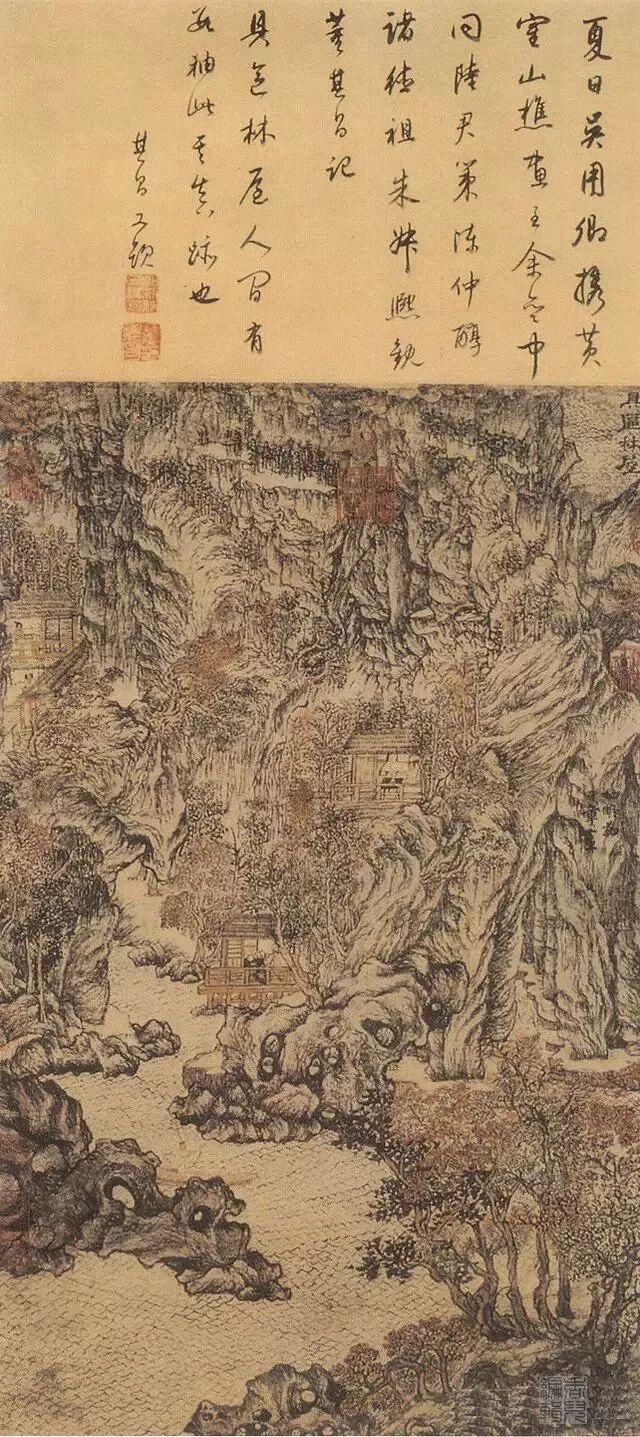 王蒙(约1308—1385),元四家之一。字叔明,号黄鹤山樵,一号香光居士。吴兴人,赵孟钔馑铩T龉袄砑洹惫僦埃登逑行」伲颉坝雎摇保橐黄鹤山(今浙江省余杭县东北),入明后,下山出仕,“洪武初,为泰安州知州”。不久因胡惟庸案株连入狱,洪武十八年九月死于狱中,享年80余岁。此画设色山涧树林,木屋亭台与淙淙溪流,画面意境清幽宜人,高士隐身于此,其乐融融。