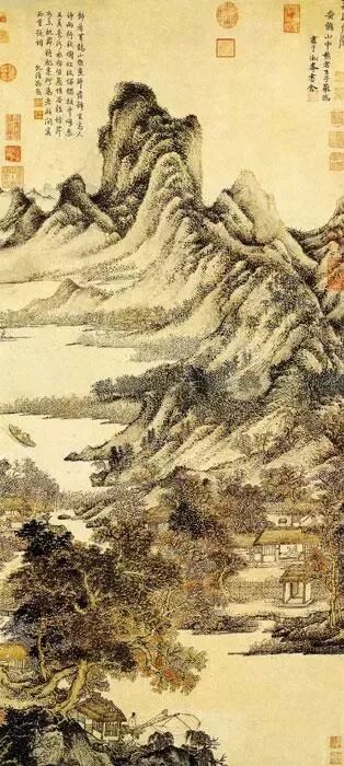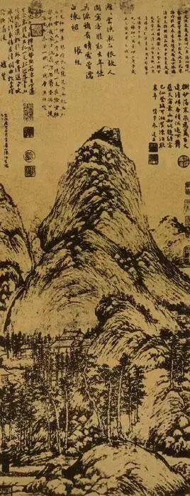 此图画作者家乡浙江的卞山。即赵孟钍疲骸昂蔚北憷砟瞎殍,呼洒登楼看卞山”之卞山。此山一名弁山,高出云霄,山石莹然如玉,下有玲珑山,石皆嵌空。上有三岩,即碧岩、秀岩、云岩。董其昌曾泊舟山下,叹曰王蒙“能为此山传神写照”。此图绘千岩万壑,峰峦曲折,山势峥嵘,气势雄伟秀拔,意境深邃,构图繁复。各种笔法和墨法互用,繁而不乱,又能展现出广阔空间,做到密而不塞,成功地表现了南方溪山林茂景深,滋润华秀的景色,是王蒙风格成熟的精心佳作,被董其昌称之为“天下第一”。
