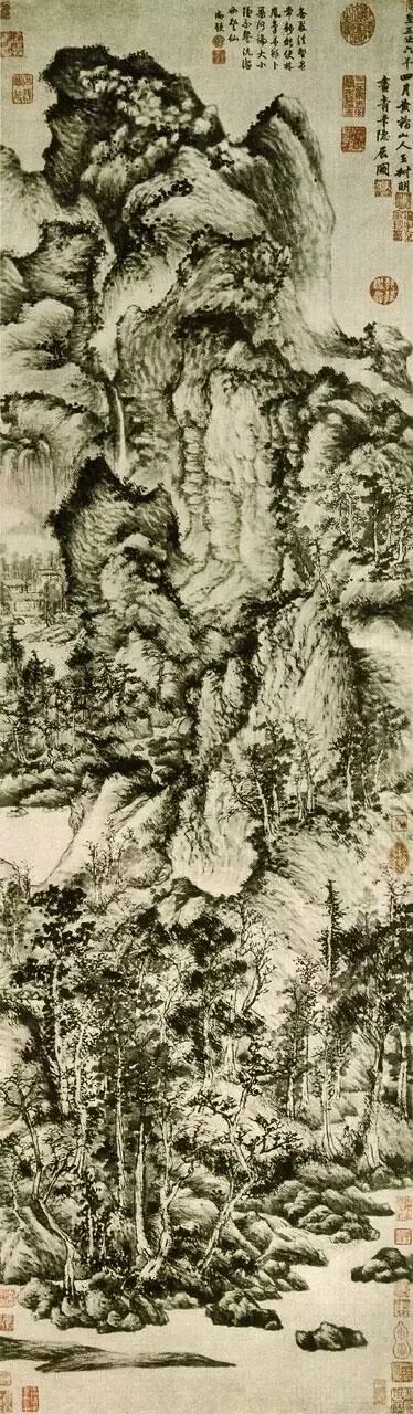 陈汝言,字惟允,临江人,元末明初名士,工于诗文书画,画山水远师董源、巨然,近师赵孟睢⑼趺傻取!栋僬扇访杌媛椒缇啊D驶呱皆毒,山峰重叠,林木森严,山下屋宇楼阁,地势幽僻。山势陡峭,瀑布飞泉 奔流而下,直追大诗人李白的“飞流直下三千尺,疑是银河落九天。” 诗意。全画结构谨严,皴擦茂密,画法出自董、巨,而近乎王蒙。