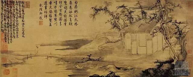 此图写林中茅屋一间,一老者策杖过桥,步伐坚定,与桥下的溪流淙淙共同构筑了画面的幽寂和飘逸。并不像过去贬斥画工的那些描述那样,很有元代文人画家的趣味。满纸水墨挥洒,不但舒意而且流畅,画家用大写意的手法,画出翠雨轩的茅舍溪桥,画面疏疏密密,浓浓淡淡,没有精心雕琢的痕迹,反而传达了一种萧闲的意境。画上有清代乾隆皇帝的御题诗,对画面意境和风格作了极为贴切的评述