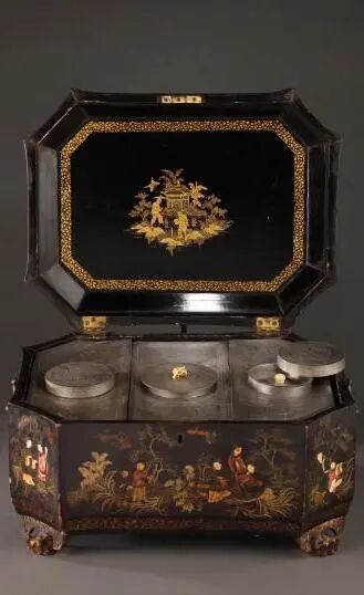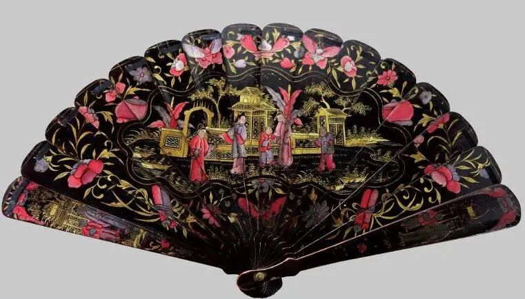 (上)黑漆彩绘描金银庭院故事纹折扇【清】