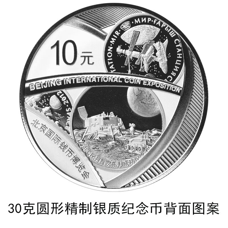 该银质纪念币背面图案以中国探月首次落月成功银质纪念币图案和哈萨克斯坦的和平号空间站纪念币图案为主体元素,结合钱币图形元素组合设计,并刊“北京国际钱币博览会”中文字样、“BEIJING INTERNATIONAL COIN EXPOSITION”英文字样及面额。![]()