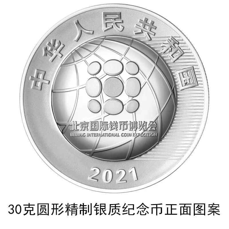 中国人民银行定于2021年10月28日发行2021北京国际钱币博览会银质纪念币1枚,该银质纪念币为中华人民共和国法定货币。该银质纪念币正面图案为北京国际钱币博览会标志,衬以地球图形及象征币齿的线条等元素组合设计,并刊国名、年号。![]()