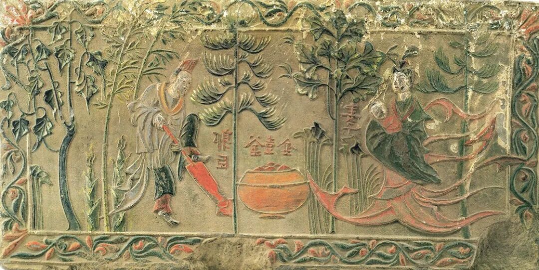 河南邓州学庄村南朝墓出土彩色画像砖![]()