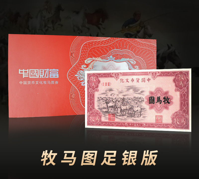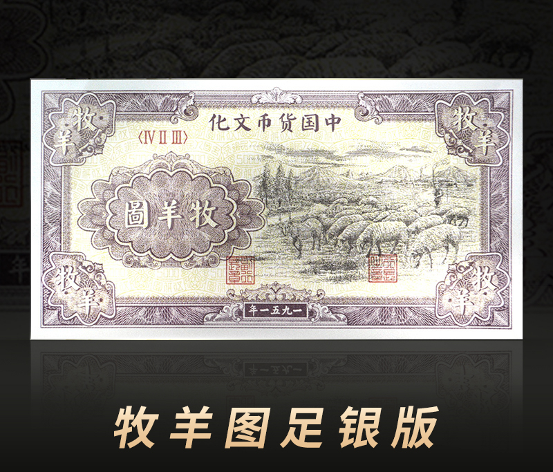 “牧羊图”尺寸为140×75mm,5克999足银复刻,底纹由“中国人民银行”、“伍仟圆”组成。![]()