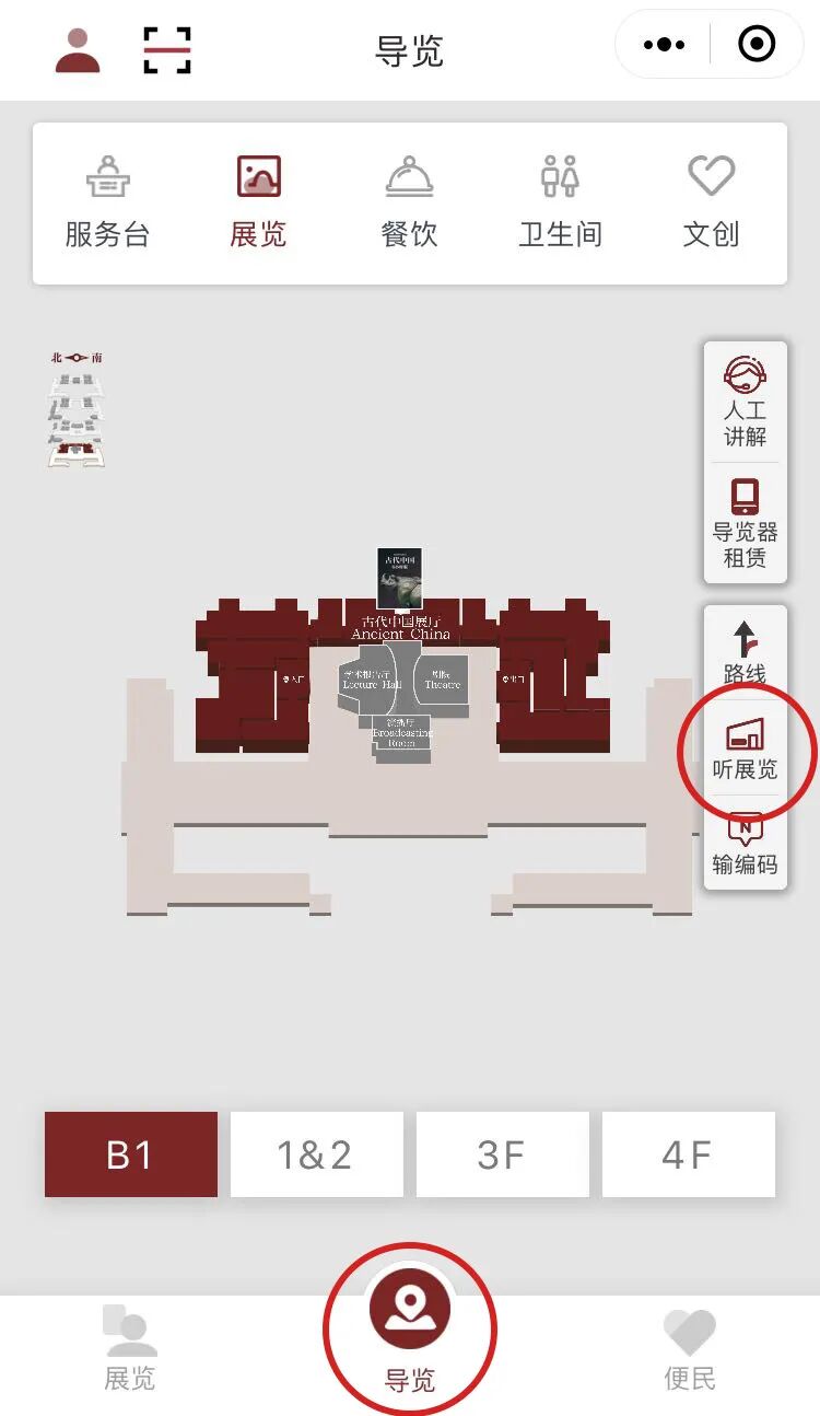 温馨提示:您也可以在打开“国家博物馆”APP后,点击页面下方“导览”,然后点击右侧导航条“听展览”,进入“展览讲解”,查看“古代中国”多版本语音导览。如图所示: