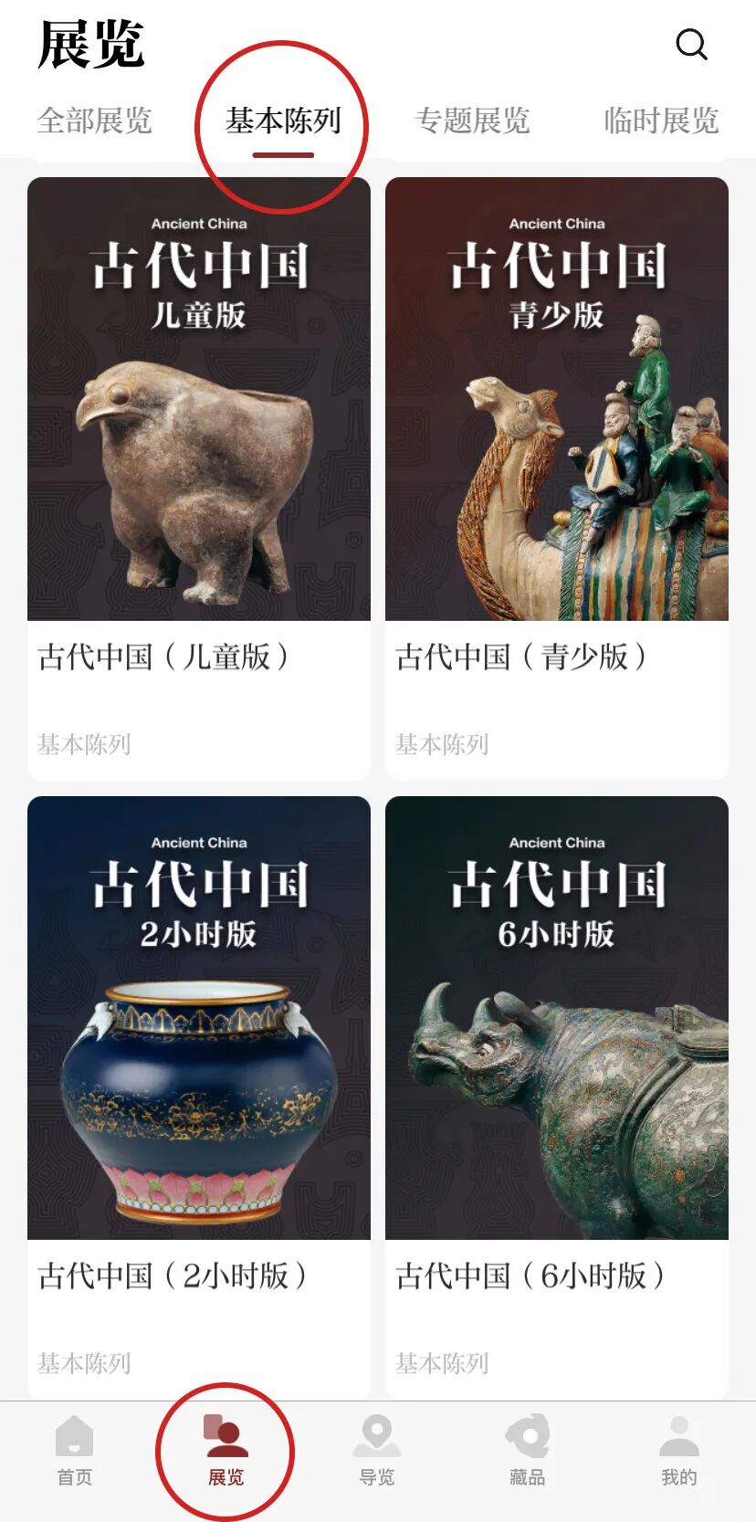3、点击屏幕上方“基本陈列”,然后向下拉一点,就看到“古代中国”多个版本分众语音导览海报啦;
