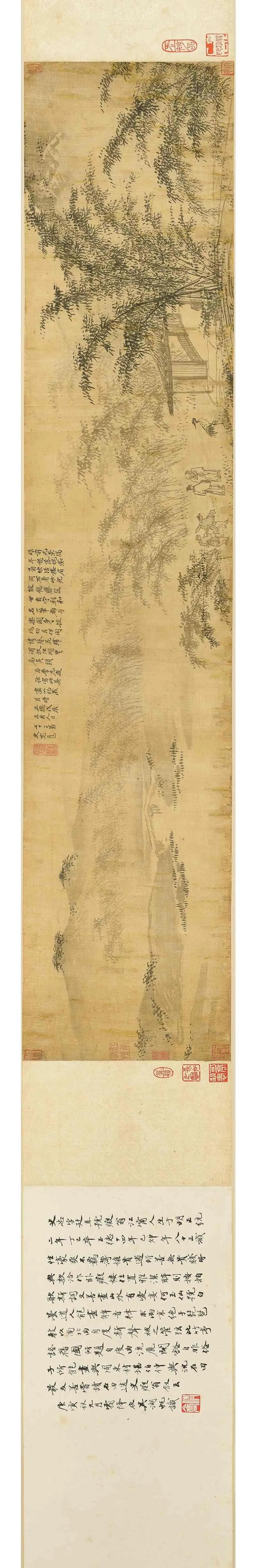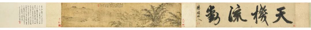 史忠本姓徐,名端本,号痴翁,又号痴痴道人,江苏南京人,与沈周、吴伟皆有往来,作画喜纵笔挥写,不拘家数,率简放逸。本卷纪年正德戊辰年(1508),绘画了婆娑竹影下一老儒与一青年对谈,旁有仙鹤及书童二人,逍遥自在。从题字可知,此乃画家与晚辈夜话后有感而作,表现出诗中「利和名一笔都勾,乐闲身披风切月。」之态。另外,本卷前有王守仁行书「天机流动」四大字引首,后有吴湖帆题跋赞赏之,几经名人过目。