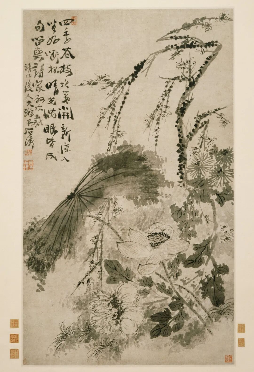 所描绘之四季花卉包括牡丹、荷花、菊花及梅花,墨色层次丰富,干湿浓淡皆全,笔法多变,清雅而不落俗套,尽显「我自用我法」。本幅为邓基哲旧藏,其官至国子监录学,长子乃邓钟岳(1674-1748),康熙十六年状元。本作品曾藏于曹仲英先生「默斋」,于2016年在洛杉矶郡立美术馆《曹氏家族藏17世纪中国绘画》展览中展出,获学术界参与研究,回响无穷。