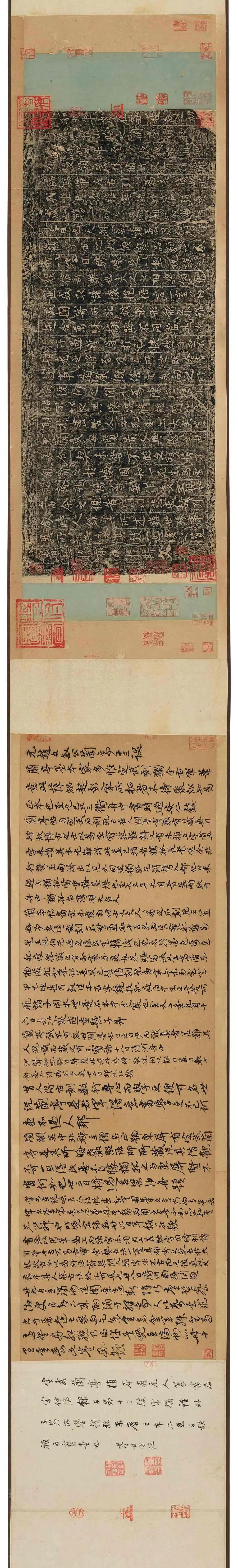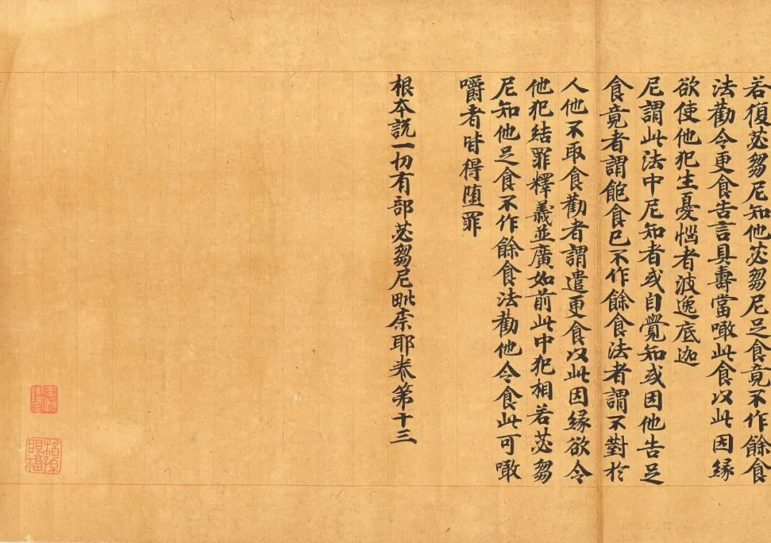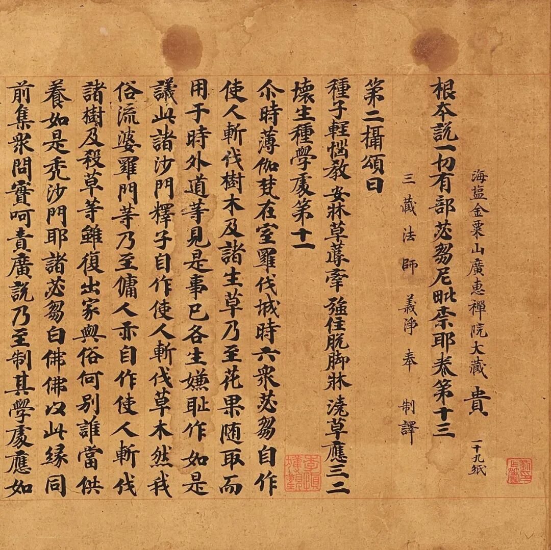 本幅为宋人写《根本说一切有部苾刍尼毗奈耶经》,约创作于公元十一世纪。宋人写经完本传世稀少,以金粟山藏经纸写成更是寥若晨星,这样的写经纸自古以来就使无数文人及收藏家趋之若鹜,乾隆皇帝甚至曾命宫中作坊仿造以供使用。本幅背面钤数方「金粟山藏经纸」小印,正面为僧人为祈福及传播佛法手书经文,为浙江海盐金粟寺出,经文及纸张皆完整无改动,极为难得。此纸改良唐代黄皮纸,内外加蜡砑光工艺,使其书写效果尤佳,历经千年沧桑,墨色如初,黝黑如漆。