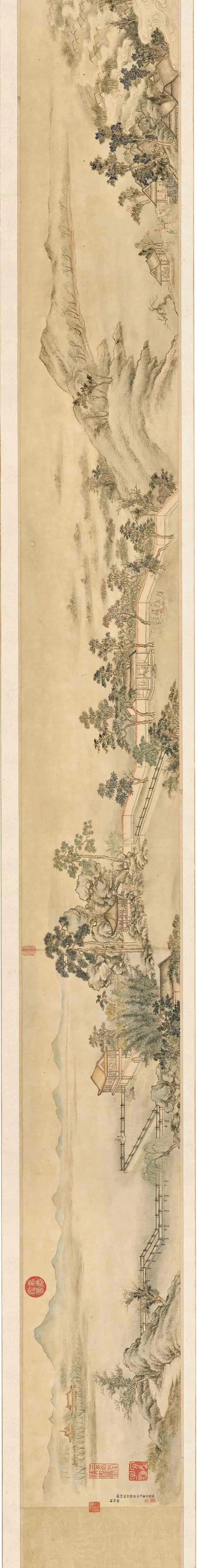 本卷创作于乾隆十一年(1746),引首为乾隆御笔「广寒清照」大字,紧接有乾隆在藏经纸上写《拟中秋帖子词有序》一篇,董邦达奉敕绘制山水,后有汪由敦钞录内廷翰林恭和御制元韵九首,内容丰富。画作整体气氛清雅,用笔钩勒细腻,墨色精良,多以轻笔皴擦,部局严谨,以对应乾隆诗文,并收录于《石渠宝笈三编》。从绘制年份、创作方向以及作品水平来看,本卷与董邦达在《伯远帖》、《快雪时晴帖》上奉敕绘制的作品,应可视为一整体,是以笔墨根据乾隆对「三希帖」之心意绘画而成,可说是由「三希帖」衍生出来的创作,视为个人绘画发展的高峯。