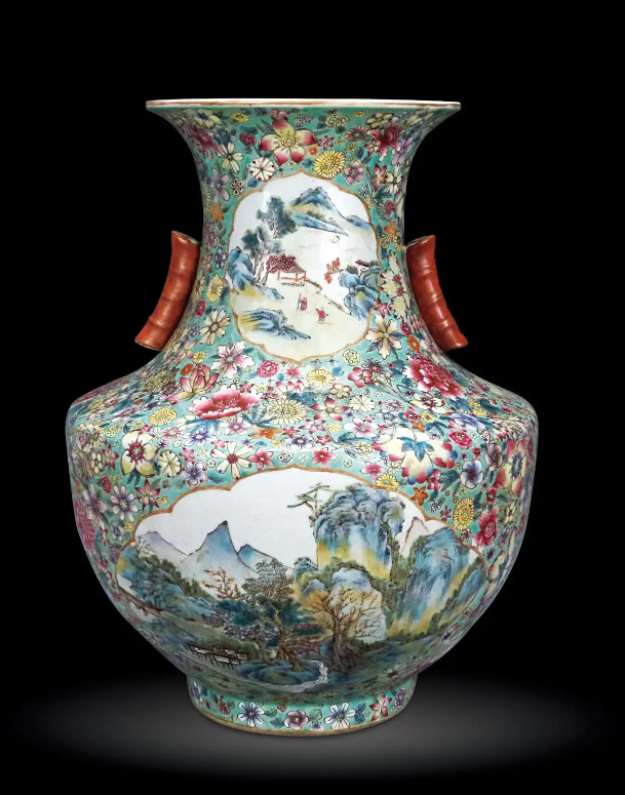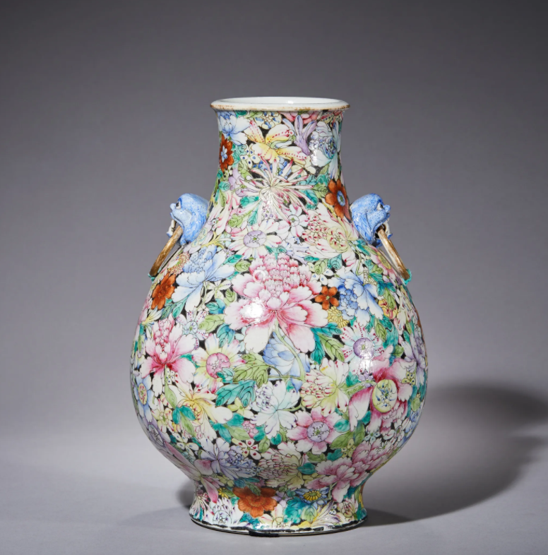 这种纹饰多在器物主体中心部位绘画牡丹等大朵纹样,在周围加绘并绘菊花、茶花、月季、荷花、百合、牵牛花等等各种小花朵图案,并且画有很精细的辅纹,让画面覆盖全器,器不露地,寓意百花呈瑞,盛世升平。
