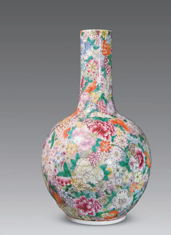 “百花不落地”的画面繁缛,极尽工巧,衬托出了器物本身的雍容华贵,强烈的视觉冲击表现出了极大的美感。