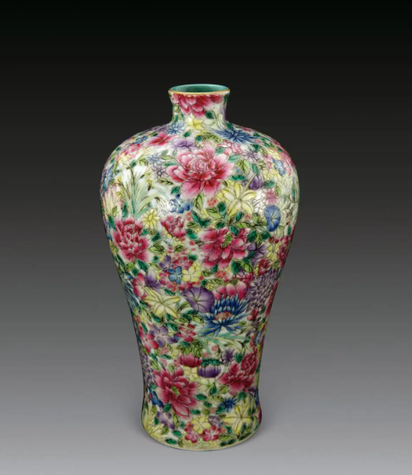 百花不落地装饰之出现必在工艺繁荣之世,考其源流,首先,需要内务府造办处出具画样,设计出百花齐聚之画稿,交付御窑厂作为粉本,其构思最妙之处则是尽收春意盎然之象而又无砌堆之感,殊为巧思。