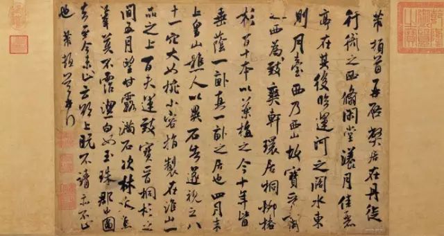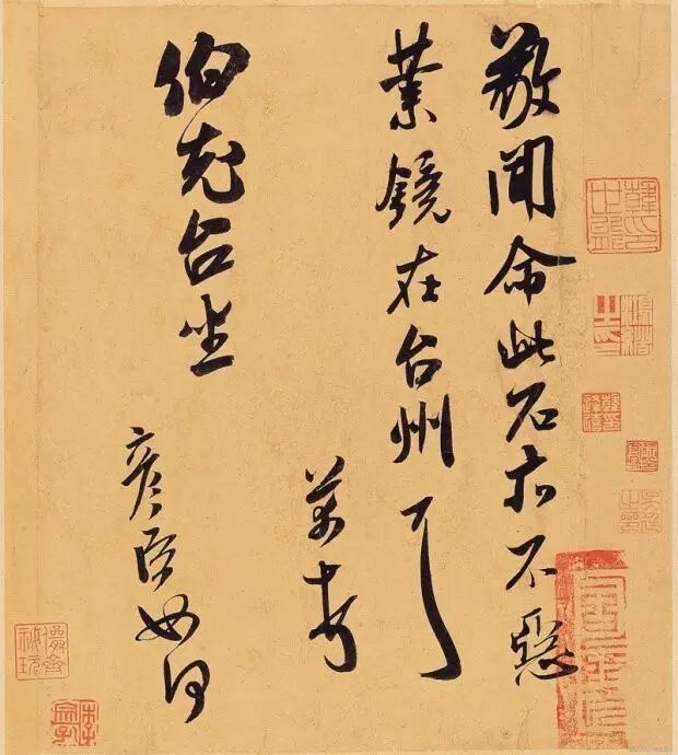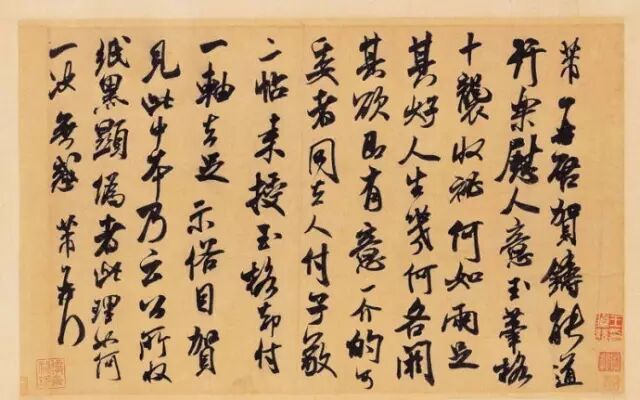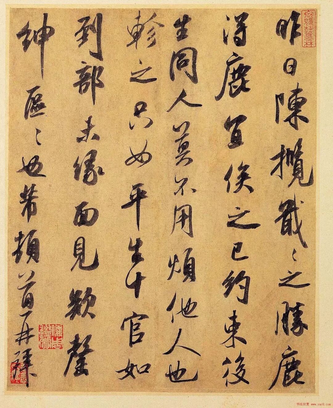 此米芾“翰牍九帖”之一,此尺牍的书法风格,正是在追求以二王为代表的晋人书札作风。米芾名其居为“宝晋斋”,十分仰慕的正是晋人风流。他研习二王甚勤,尤其《蜀素帖》,后半部全从右军《兰亭》中来。但他最为倾心的是“破体”的小王,故《海岳名言》有谓:“子敬天真超越,岂父可比也。”落笔痛快,气势开张,英俊豪迈,更契合于米芾的性格。《丹阳帖》的写法就和献之笔札相近。但是,既经“重法”的唐代,提按已是普遍的笔法,兼之米芾个性强烈,字势愈加跌宕,用笔更形起落,牵丝显露,出锋锐利,真是“风樯阵马,沉著痛快”,大胆而泼辣,尺素之间亦使出了浑身解数.这与二王的散淡就有了距离.米芾毕竟还是米芾,米字到底还是米字,他能著名书史,开宗立派,不是没有缘由的。