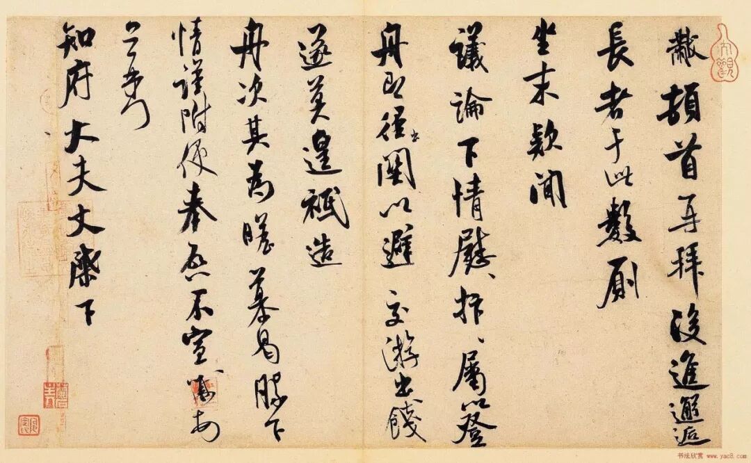 虽说此幅是米芾的“少作”,但并不因此降低《知府帖》的艺术价值。整个布局上,以余浅见,只有首行有小缺失,首字“黻”略小,且第二字“顿”的气势大大的压过了“黻”字,这是在一般行草作品中罕见的。“邂逅”二字也许是为了章法排列,挤在一块儿,美中不足。前六行的用笔几乎一样,片状的笔法多,这也是米芾的作品一大特色之一,虽是小字的尺牍,字字仍饱满不单薄;末四行始,笔锋转为用中锋较多,尤其“慕”字以下,少了小心翼翼的笔法,书写时多了情意,信笔挥洒开来,硬挺的线条搭配厚重的笔触,使后半部有不一样的特色。