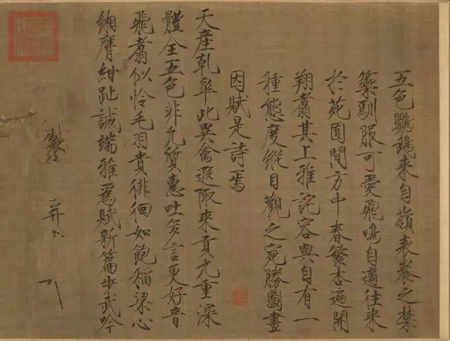 ▲宋徽宗《五色鹦鹉图》,绢本,卷,楷书,后期风格,美国波士顿艺术博物馆藏。