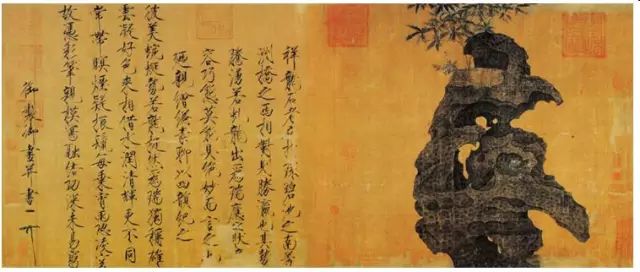 ▲赵佶《祥龙石图》,楷书,绢本,设色,后期风格,北京故宫博物院藏。