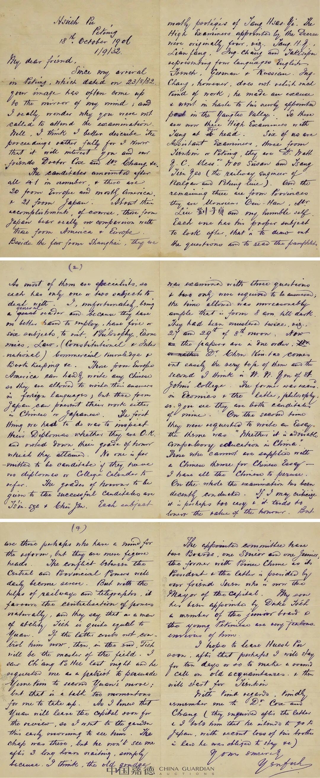 考生总计41人,其中20人来自欧美,主要是美国,其余21人来自日本。至于他们的成绩,日本考生自然无法与欧美考生相提并论。除了极少数来自上海的,他们大部分是唐绍仪挑选的。学部奏定的主试官原本是唐绍仪、联芳、荫昌和塔克什讷,分别负责英语、法语、德语和俄语。然而荫昌不敢任此工作,寻一借口便急匆匆赶往长江流域去任他的新职了。所以现在共三位主试官,唐是领头人。六位襄校官中,三位来自燕山和北京,他们是屈永秋、吴仰曾和詹天佑(京张铁路工程师)。其余三位来自省外,他们是魏瀚先生、刘子贞先生和在下。每人有专门负责的科目,需要出题和阅卷。这些考官多为某领域的专家,每人只管一两个学科。而我读书驳杂,且他们雇不到更多人手,所以我不幸要负责五至六个学科,即哲学、经济、法律(宪法和国际法)、商学和图书保存。来自欧美的考生几乎不会写中文,所以被准许用外语答题;但来自日本的则可用中文或日语作答。凡是无法提供学位证书的考生将取消考生资格。成功通过考试的学生按成绩获得进士或举人称号。每门学科包含三题,考生只需回答两道。答题时间从上午8点到天黑,实在是过于充裕了。考试曾拟分两次举行,即8月27日和29日。如今,两份考卷已合二为一。陈锦涛博士轻而易举地取得了第一名,第二名是圣约翰学院的颜惠庆。前者考经济,后者考哲学。所以如你所见,他们二人都是我负责的考生。在第二场考试中,他们被要求写一篇论文,题目是“中国是否适宜推行义务教育”。对于不会外语的人则提供一个中文题目,可用中文写作,答卷由我批阅。总体而言,考试举办得很顺利。如果要挑毛病的话,我觉得题目大概太简单了,如此一来便降低了考试成绩的说服力。随着洋务运动官费欧美留学生的派出,出国留学成为晚清青年学子一种新的追求。光绪三十一年(1905)科举制废除之后,又进一步促使大批青年负笈海外,形成了近代中国第一次留学热潮。这些留学生知识结构新颖,思想活跃,热情高,创新意识强,是难得的人才。清政府迫切希望利用他们的才能来巩固摇摇欲坠的封建统治,于是由统管教育的学部对非军事类归国留学生的任用逐渐形成了以考试为主的选拔录用办法。自光绪三十一年(1905)到宣统三年(1911)学部共举办七届留学生归国选拔考试,严复作为襄校官,参加了其中的第二届(1906)、第三届(1907)、第四届(1908)考试,负责考试、阅卷事宜,并对归国留学生学位文凭等第作出评定。出版:皮后锋著:《严复大传》,福建人民出版社,2003年,P245。著录:皮后锋著:《严复评传》,南京大学出版社,2006年,P174-175。之后严复在信中又从旁观者的角度向伍光建解析了丁未政潮前夕的京师政治格局,并提到他在京师与张百熙、袁世凯等政界要人的交游情况,对中国近代教育史、晚清民国政治史、严复思想研究而言,均为重要的一手资料。同时此通信仅部分内容在《严复大传》、《严复评传》中有引述与出版,但全文未收录于《严复全集》之中,其全貌外间从未得见。