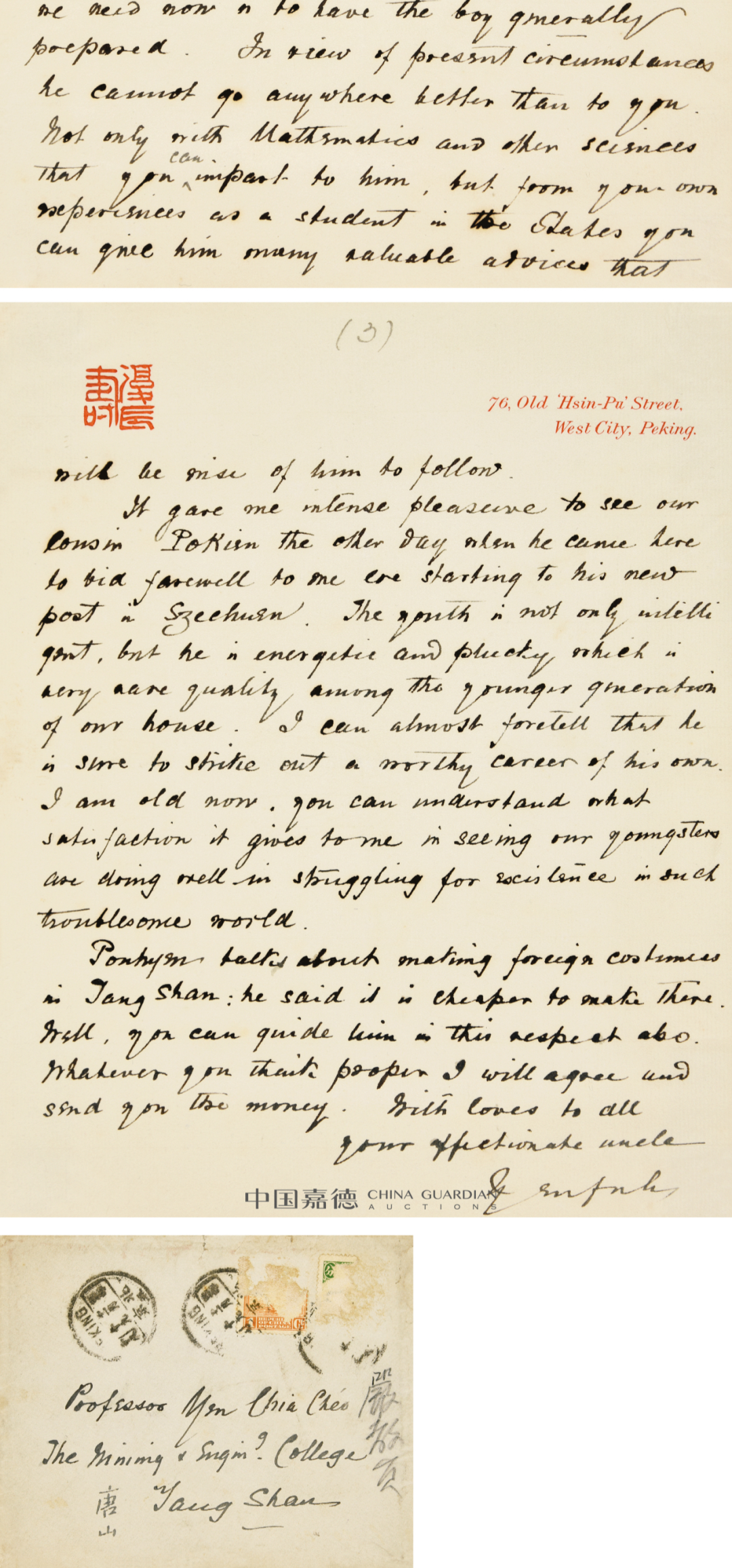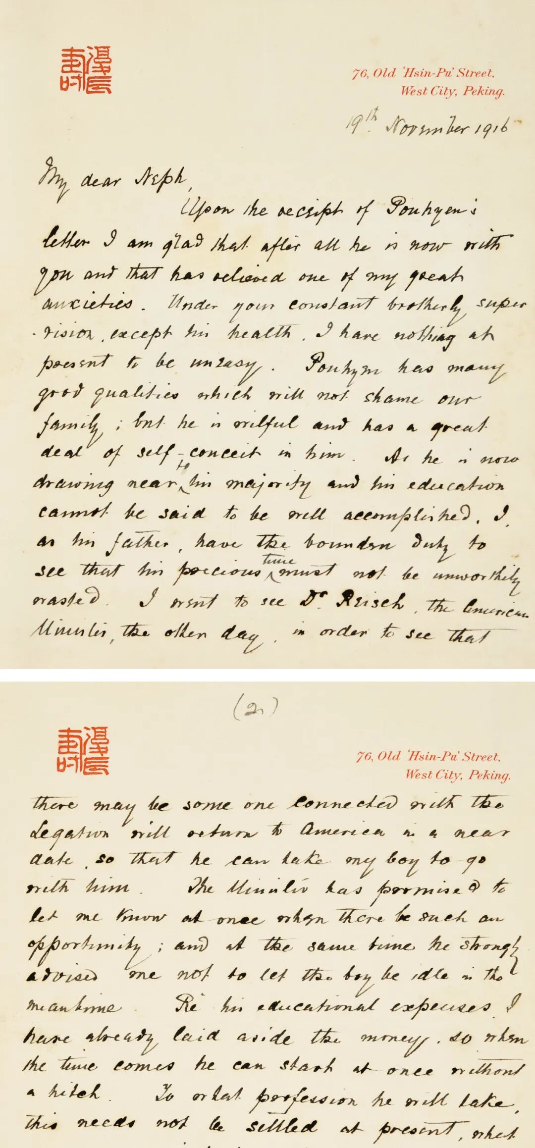 前些天,我去见了负责人Reiseh博士,以确保近期有来自公使馆的人返回美国时能带上我的儿子。负责人保证一有类似机会就告知我,同时强烈建议我这段时间也不要让儿子无所事事。他有受教育经历,我也有足够的储蓄,因此时机一到他就能立刻投入即将从事的职业中。这在目前无需预先计划,现在要做的是让我儿子做好全面的准备。鉴于个人情况,他去哪里都不如去你那里好。你不仅能教他数学和其他自然科学知识,更能从自己在Shales的求学经验中总结出宝贵的建议,他一定能从中获益。咱们的表亲Poukysn将赴Szcehuen任新职,前些日来与我道别我见到他无比开心。这位青年不光聪颖,更是富有活力、勇敢大胆,这样的品质在咱们家年轻一代中非常少见。我预言,他必定能开创出属于自己的有价值的事业。我已经老了,当我看到年轻人在如此混乱的世界里追求卓越、不断奋斗,那种满足和欣慰的心情你想必能够理解。Poukysn曾提到在唐山建立外国聚居区,他说在唐山成本更低。你来在这方面指导他吧。凡是你觉得合适的事情,我都将同意并给你寄钱。问所有人好,爱你的叔叔严复。严伯鋆(1884-1934),名家驺,字伯鋆,福建侯官人。严复堂弟严观澜之子,淳斋主人严群之父。福建第一位庚款留学生,1913年获伊利诺斯大学数学学士学位,1914年获哈佛大学数学硕士学位。归国后执教交通部唐山工业专门学校,曾任数学系主任。1919年应严复长子严伯玉之邀到盐务署系统任职,先后出任福州、浙江、陕西等地的盐务局任局长。