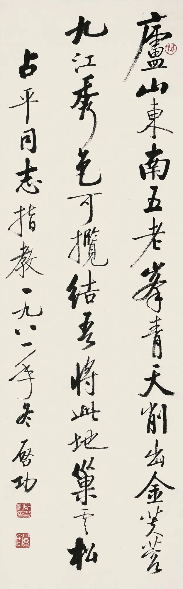 庐山东南五老峰,青天削出金芙蓉。九江秀色可揽结,吾将此地巢云松。占平同志指教一九八一年冬,启功。