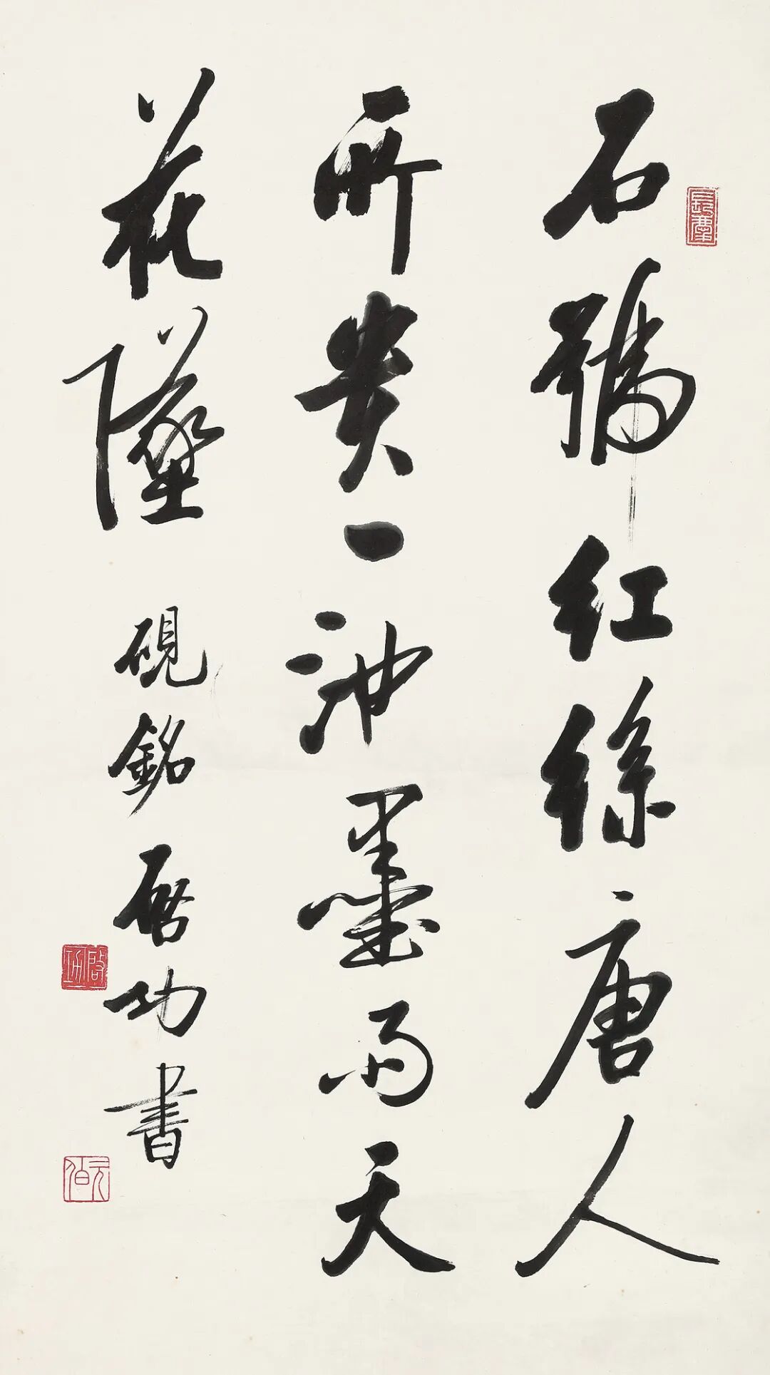 先生一生与笔砚为伴,喜欢藏砚,每得佳砚,必作铭记之,故其砚铭最多。本幅“石号红丝,唐人所贵,一池墨雨天花坠。”行书砚铭,对红丝石砚盛誉之情溢于言表。