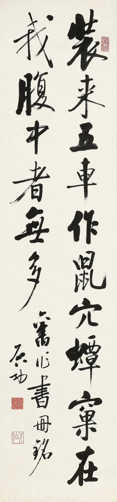 启功先生凡用过的物品,多有铭文记之,读来幽默风趣,令人低徊。此幅“装来五车,作鼠穴蟫窝,在我腹中者无多。”是先生为书箱作铭,既言藏书,又是谦虚之语。
