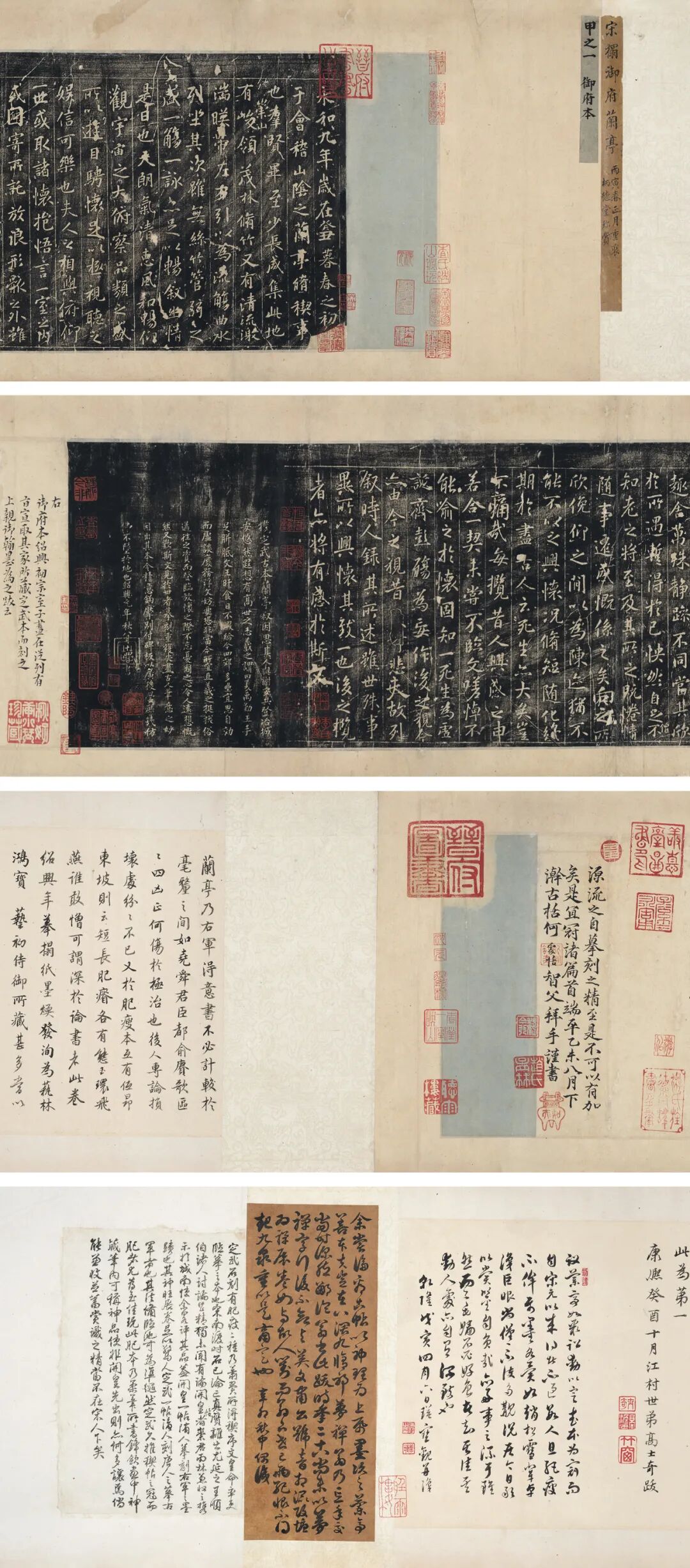 1.王连起《<兰亭序>重要传本简说》,第98页,图“宋高宗内府重刻定武五字已损本”,《紫禁城》2011年第9期。2.王连起《关于<兰亭序>的若干问题》,第82-85页,《书法丛刊》2012年第5期。3.王连起《游相兰亭及其百种第一件<甲之一御府本>简述》,第118-119页,《中国书法》2015年第6期。3.胡世安《禊帖综闻》卷五,“御府”,南京图书馆藏清初刻本。4.卞永誉《式古堂书画汇考》,书卷第五,“宋御府拓定武兰亭卷”。5.倪涛《六艺之一录》,卷一百六十,页二十,“宋御府拓定武兰亭卷”,景印文渊阁四库全书第八三三册,台湾商务印书馆,1986年。6.吴升《大观录》,唐贤法书卷二,“宋御府拓定武兰亭卷”。7.张珩《木雁斋书画鉴赏笔记》,书法—木雁传真第四编(1963年),“宋拓御府兰亭卷”,第248页,文物出版社,2000年。8.宇野雪村《游相本兰亭考》,第31页,《东洋研究》1973年3月。9.顾廷龙《顾廷龙文集》,“宋游相藏兰亭述略”,第481页,上海科学技术文献出版社,2002年。10.白锐《唐宋<兰亭序>接受问题研究》,第174页,南方出版社,2009年。11.陈一梅《宋人关于<兰亭序>的收藏与研究》,第95页,中国美术学院出版社,2011年。12.王连起《中国书画鉴定与研究 王连起卷 下》,“关于《兰亭序》的若干问题”,第638-639页,故宫出版社,2018年。2.游似(宋)、何处恬(宋)、高士奇(清)、瑛宝(清)、英和(清)、佚名(清)题跋。3.游似(宋)、朱棡(明)、徐树谷(清)、查莹(清)、英和(清)、李意西(清)、李慎(清)、爱新觉罗·岳琪(清)、崇恩(清)、魏今非(现代)递藏。