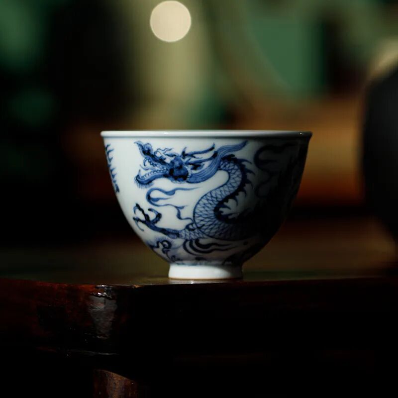 敞口深腹小圈足,内底下凹,外底凸出似鸡心而得名鸡心杯。外壁一周绘龙纹,龙纹细颈身长曲度大,龙有三爪,周身火焰,腾飞于海浪之上,矫健凶猛。