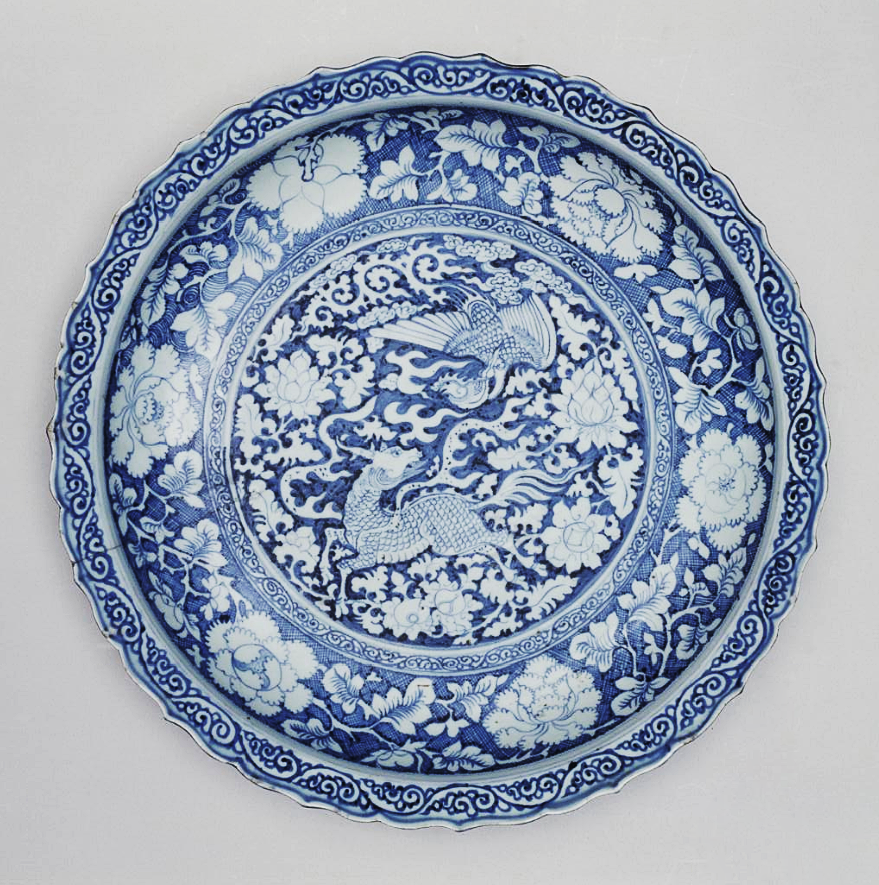 元 青花蓝地白花飞凤麒麟纹菱花口大盘(口径46.1厘米)