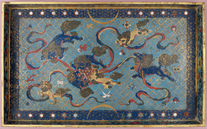 狮子形象是随佛教传入中土的。在佛教中,狮子是佛的护法。作为文殊菩萨的座骑,其又是智慧和力量的象征。唐以前,狮子还是寺庙、陵墓的保护神。约在唐代,狮子又被视为权势的象征。至宋代,新出现了狮戏毬的形式,开始进入普通人的世俗生活,并被更多地赋予了吉祥、和谐的寓意。宋人《梦林玄解》狮滚毬而戏吉条云:“狮乃兽中之王,滚毬而戏,从容闲暇之象也。梦此为安乐喜庆之兆,兄弟合,夫妇和,父母顺,家道丰亨,口舌解散,争讼消释,诸事皆吉。”受宋人影响,狮戏毬装饰在明代瓷器上非常流行。