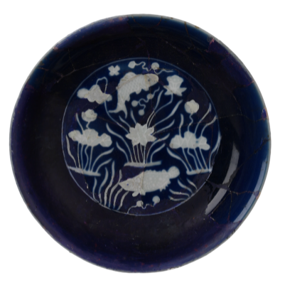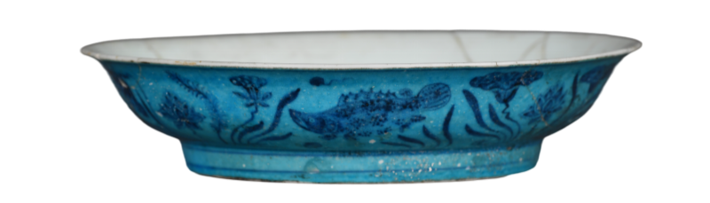 此碗外壁以蓝釉为地,用白釉填绘四鱼游于水草、浮萍与莲荷之间,鱼为宣德常见的鲭、鲌、鲤、鳜四种。把中空底书“宣德年制”款。此器白花纹起凸,可见其工艺是先按纹样剔去蓝釉,再填以白釉进行装饰。