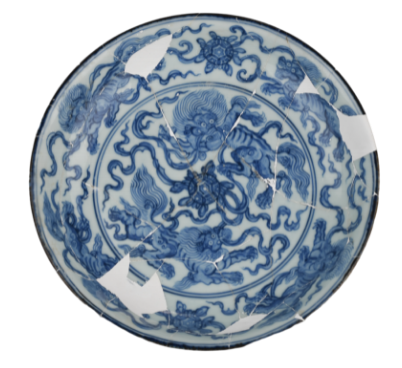 盘内底青花双圈内绘青花双狮戏绣球纹,绣球结带飘扬,动感极强。内外壁均绘两组双狮戏毬纹。