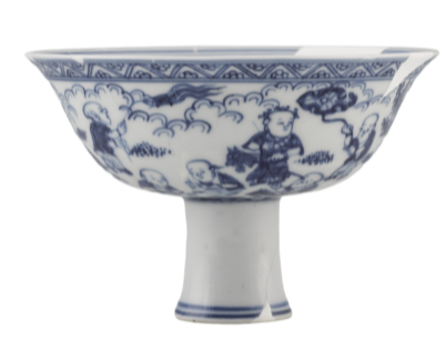 明宫廷青花瓷器以庭院婴戏图装饰,从永乐至万历一直兴盛不衰,就童子人数来讲,有五子、七子、十子、十三子、十六子不等,而各代青花用料与画风均各具特征。