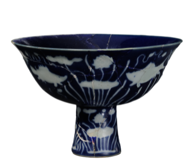 蓝地填白鱼藻纹高足碗