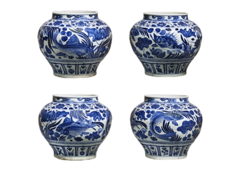 鱼藻纹是明宫廷瓷器常见装饰题材。宋代陶瓷已流行双鱼纹装饰。元代青花开创以鱼藻纹装饰瓷器,其画面多表现游鱼、莲荷、浮萍、水藻等物象,一般装饰于罐、盘、碗等器物的腹壁、底心等主要部位。这类图案具有强烈的写实感,绘画细致入微。明宫廷瓷器承元代之旧,鱼藻纹颇为流行。尤其是宣德帝力兴文艺,擅于绘事,有御笔《莲蒲松荫图》传世。受此影响,宣德时期宫廷瓷器也多鱼藻纹为饰,且画艺精湛。