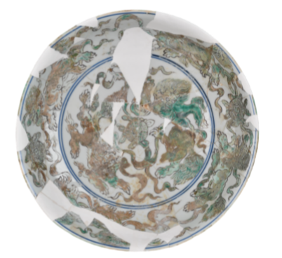 盘内底青花双圈内绘一组绿彩双狮戏毬纹,内外壁均绘两组双狮戏毬纹,釉上绿彩清新淡雅,可见当时的审美风尚。