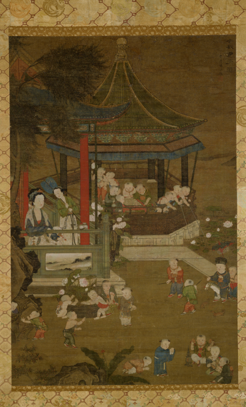 婴戏纹是明宫廷瓷器装饰的典型纹样之一。自唐代长沙窑青瓷开创陶瓷婴戏后,宋代南北各窑口均有采用,题材有婴戏花、婴戏球、婴戏鸭、婴戏鹿等,以婴戏莲较为多见。明宫廷瓷器婴戏图更加盛行,画面亦更丰富多彩,以各种游戏场面入画,以十六子和百子最为典型。